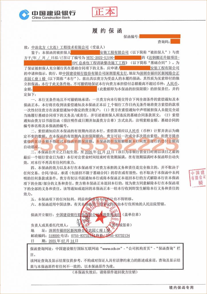 合同指定保函格式,我司按照指定格式出函一字不改。该公司具有二级资质,免保证金受理,仅收取担保费。客户联系我司为7月10日,我司10日完成确认格式,客户提供签约资料盖章扫描件后寄出给我们,11日我司收到纸质资料,11日下午发送反担保链接,客户12日签署完成,12日下午打款,14日中午出函,总体耗时3个半工作日。