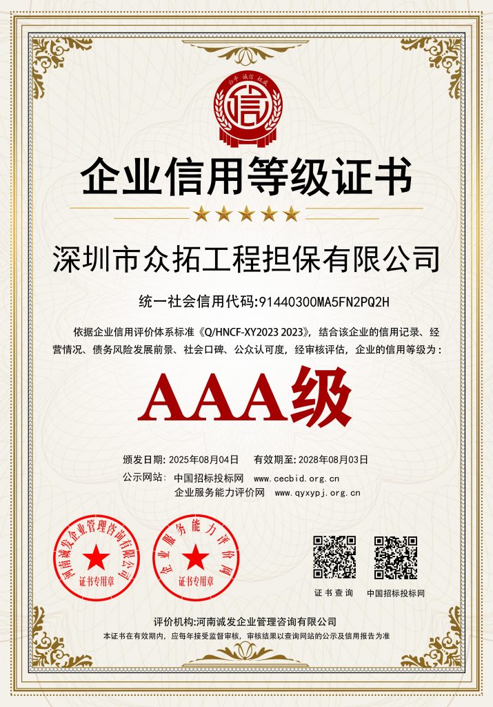深圳市众拓工程担保有限公司成立于2019年06月11日,注册资金20000万元人民币。公司旨在为全国的工程建筑、环保绿化、水利水电、公共基础设施建设、机电通讯、政府采购、境外招投标等企业提供便利的保函保证担保服务,并依托公司平台优势,积极参与工程保函制度的推广,参与住建部工程担保课题承办,团结工程担保同业、规范行业发展、提升行业社会影响力。在行业内实现风险共担的基础上,为银行的风险控制提供了更有效的保障,为工程担保事业奠定坚实基础,为经济社会发展提供更加优质的综合金融服务。公司将继续秉持“诚信、高效、专业、创新”的核心价值观,致力于工程担保领域、创造专业担保平台、持续为社会创造价值。